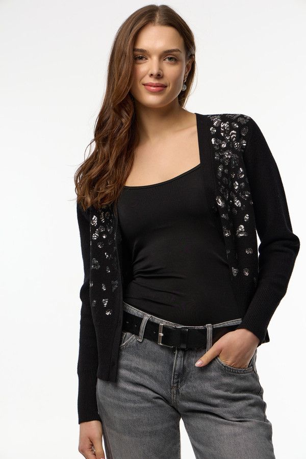Shine on with our Deco Drip Sparkle Cardigan, a show-stopping piece that blends classic style with modern glamour. This V-neck cardigan is crafted from a comfortable black knit, serving as the perfect backdrop for its dazzling design. The front panels are embellished with shimmering silver sequins arranged in a unique "deco drip" pattern, creating a captivating cascade of sparkle. Wear it buttoned up as a top or layered over a simple camisole to make a bold statement for a night out or special event.
