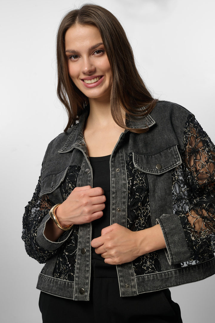 Elevate your fall wardrobe with our Denim Lace Jacket. This versatile piece features a classic denim exterior and a delicate floral lace overlay on the front and sleeves, creating a stunning contrast. The full button closure provides ample warmth and styling options. Pair it with a tank and slacks for a casual look, or layer it over a dress for a touch of feminine edge. This jacket is the perfect transitional piece to keep you stylish and comfortable as the seasons change.