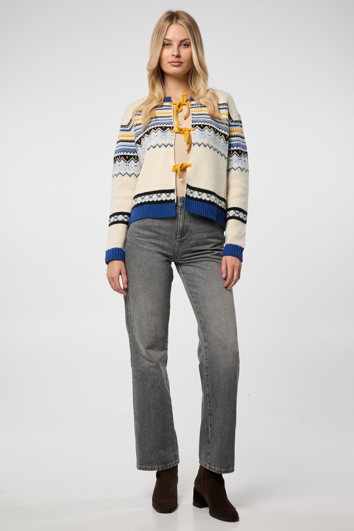 Embrace cozy-chic style with our Fair Isle Multi Tie Front Cardigan. This charming knit sweater features a classic Fair Isle pattern in a festive palette of blues, yellows, and black. A unique multi tie-front closure, with contrasting knotted ties, adds a whimsical and bohemian touch to the traditional design. Perfect for adding a pop of color and personality to your cold-weather wardrobe, this cardigan is an effortless layering piece for any casual outing.