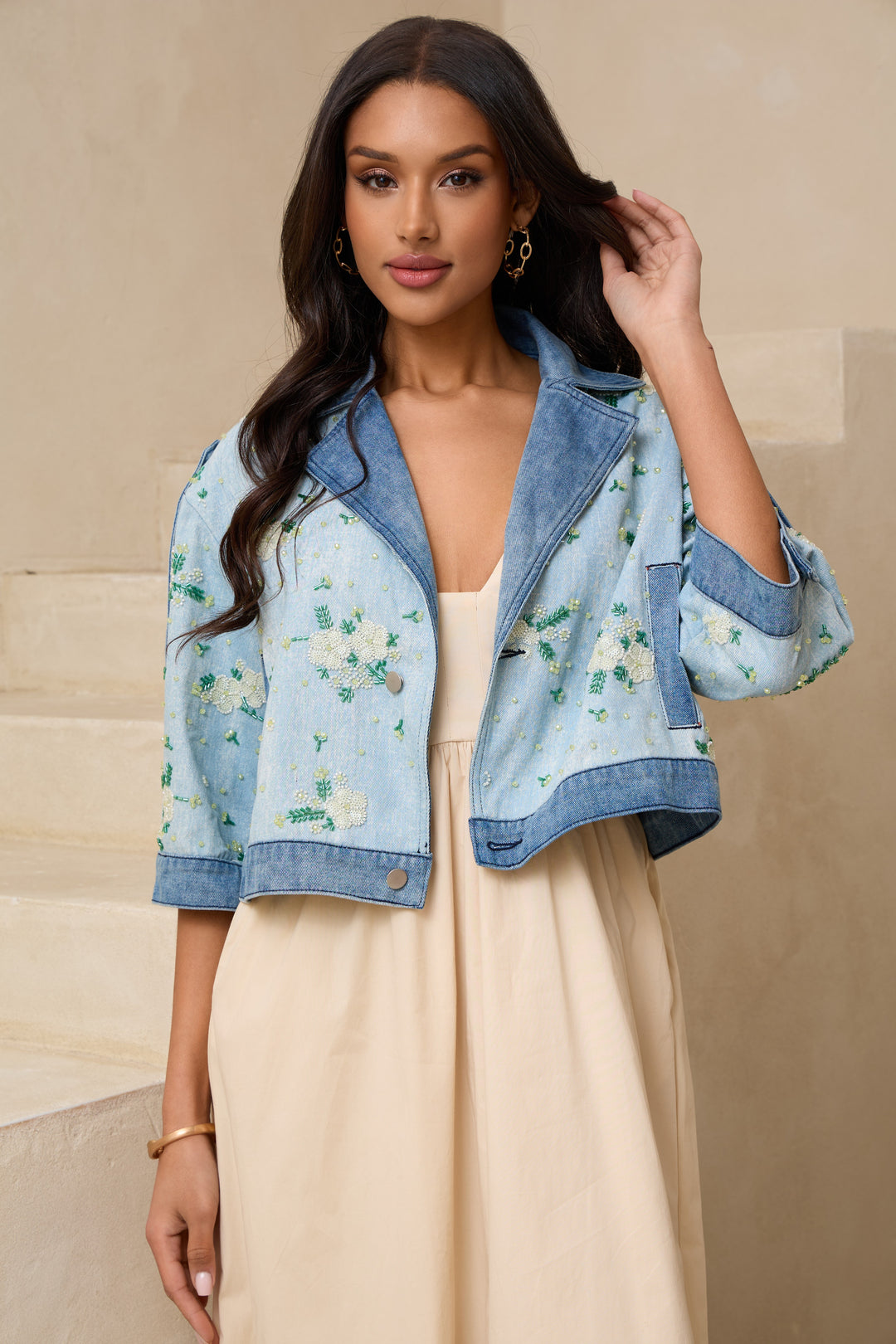 Flower Beaded Short Denim Jacket