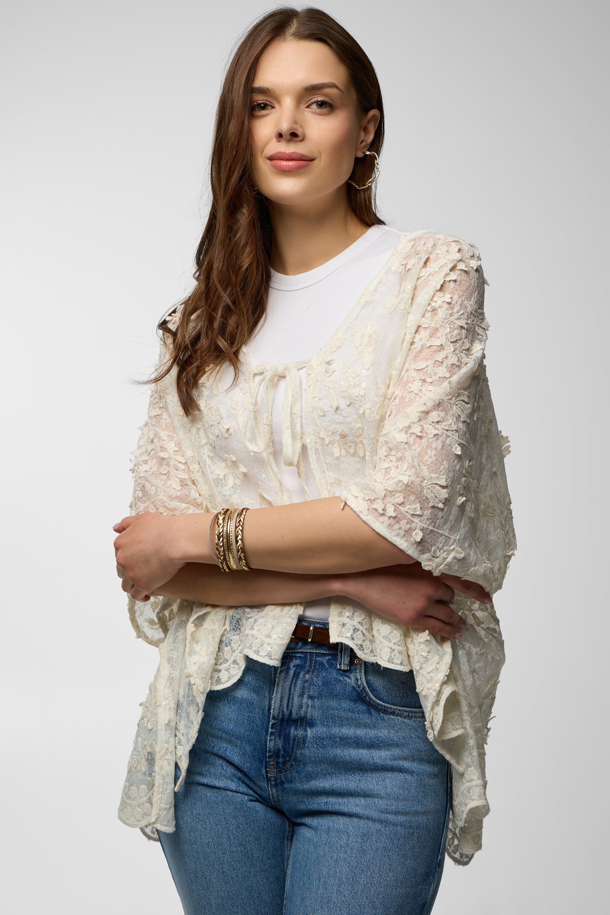 This Floral Lace Tie Front Ruana is an ethereal layering piece, featuring delicate sheer lace with a beautifully intricate, three-dimensional floral pattern. The relaxed, wide silhouette drapes elegantly over the shoulders, offering beautiful movement and a customizable fit with its subtle front tie. Layer this ruana over a simple slip dress for a bohemian-chic evening look, or pair it with white denim and a tank top for elevated daytime elegance.