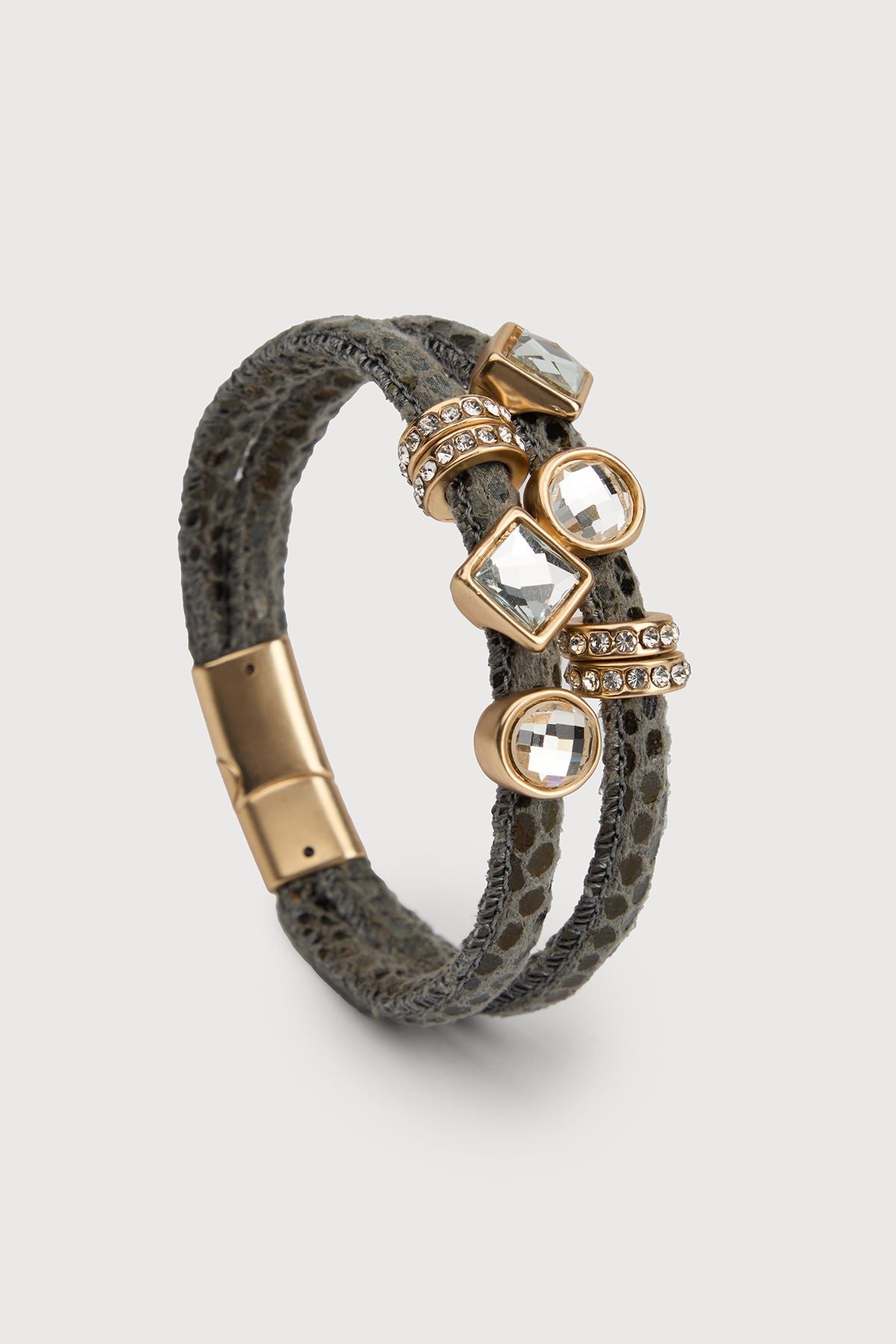 Our Bling Charm Leather Bracelet strikes the perfect balance between edgy texture and radiant glamour with its snake-print band and bold, sparkling crystal charms. The double-strand design is accented by large, multi-shaped crystals set in gold-toned rings, secured by a modern magnetic clasp. To draw attention to its luxurious shine, pair this bracelet with a long-sleeved black top or a sleek watch for an elevated, contemporary contrast.