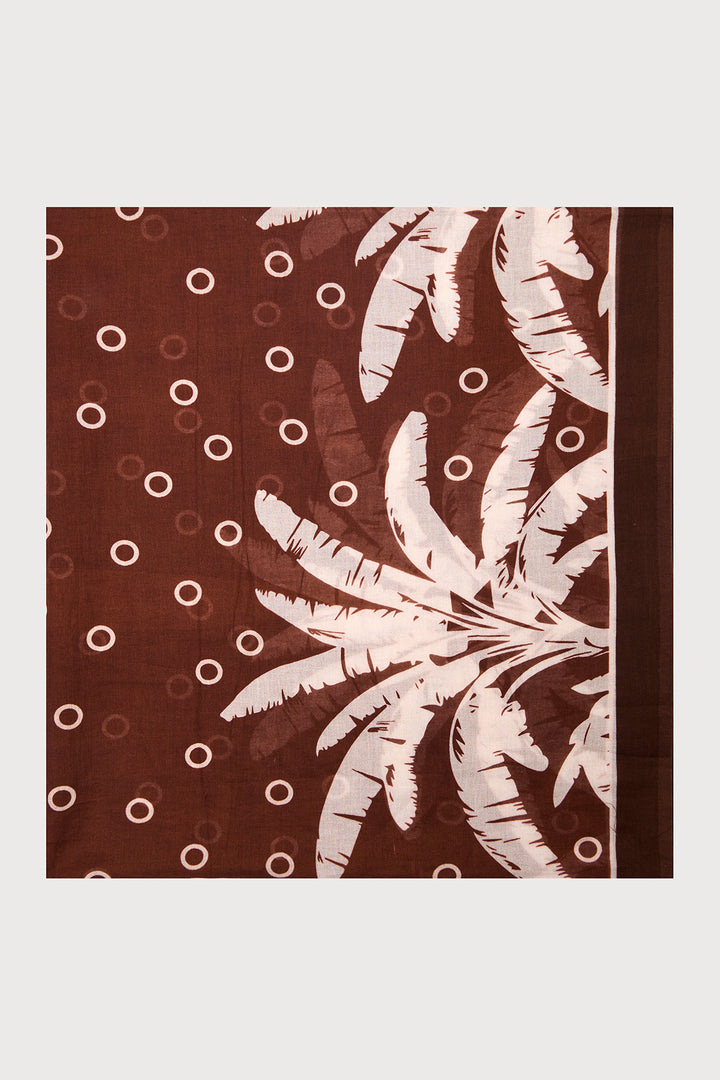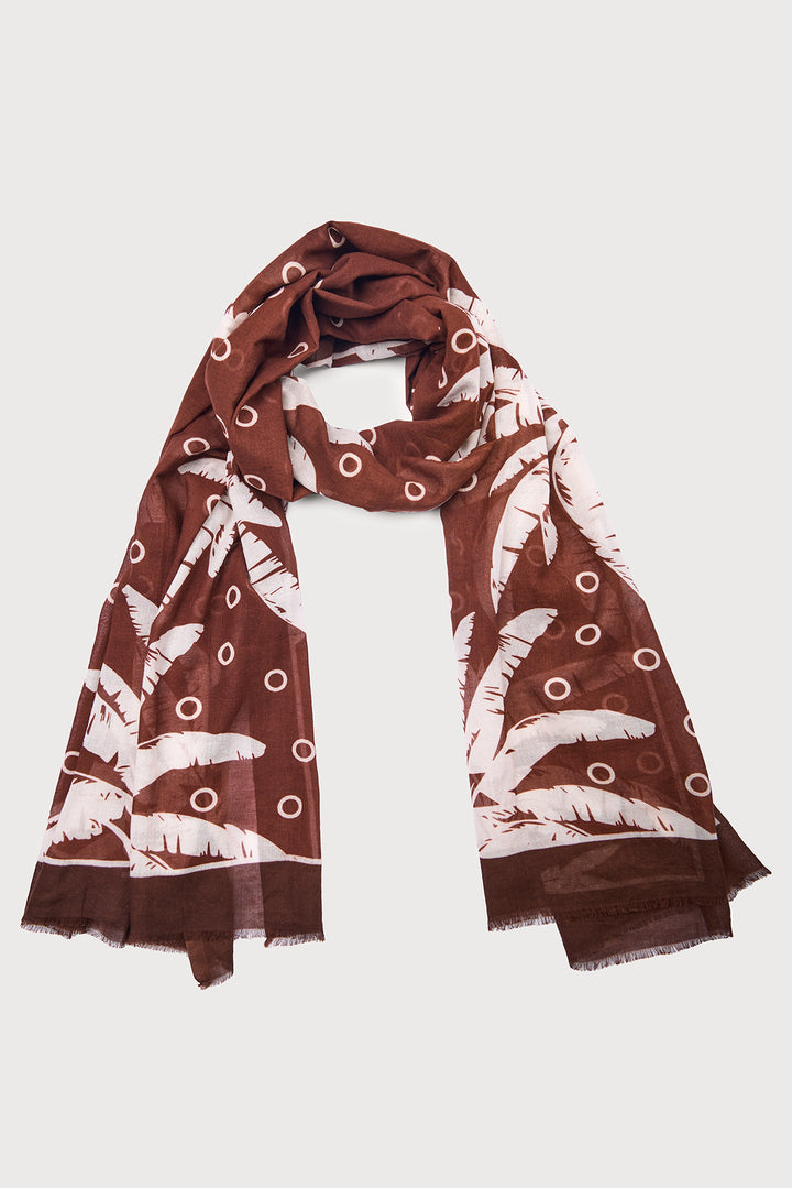 Escape to paradise with the Coconut Palm Print Scarf. This stylish scarf features a striking print of coconut palm fronds and subtle circular accents. The soft fabric and versatile design make it perfect for adding a touch of tropical flair to any look, whether relaxing at the resort or a summer night out.
