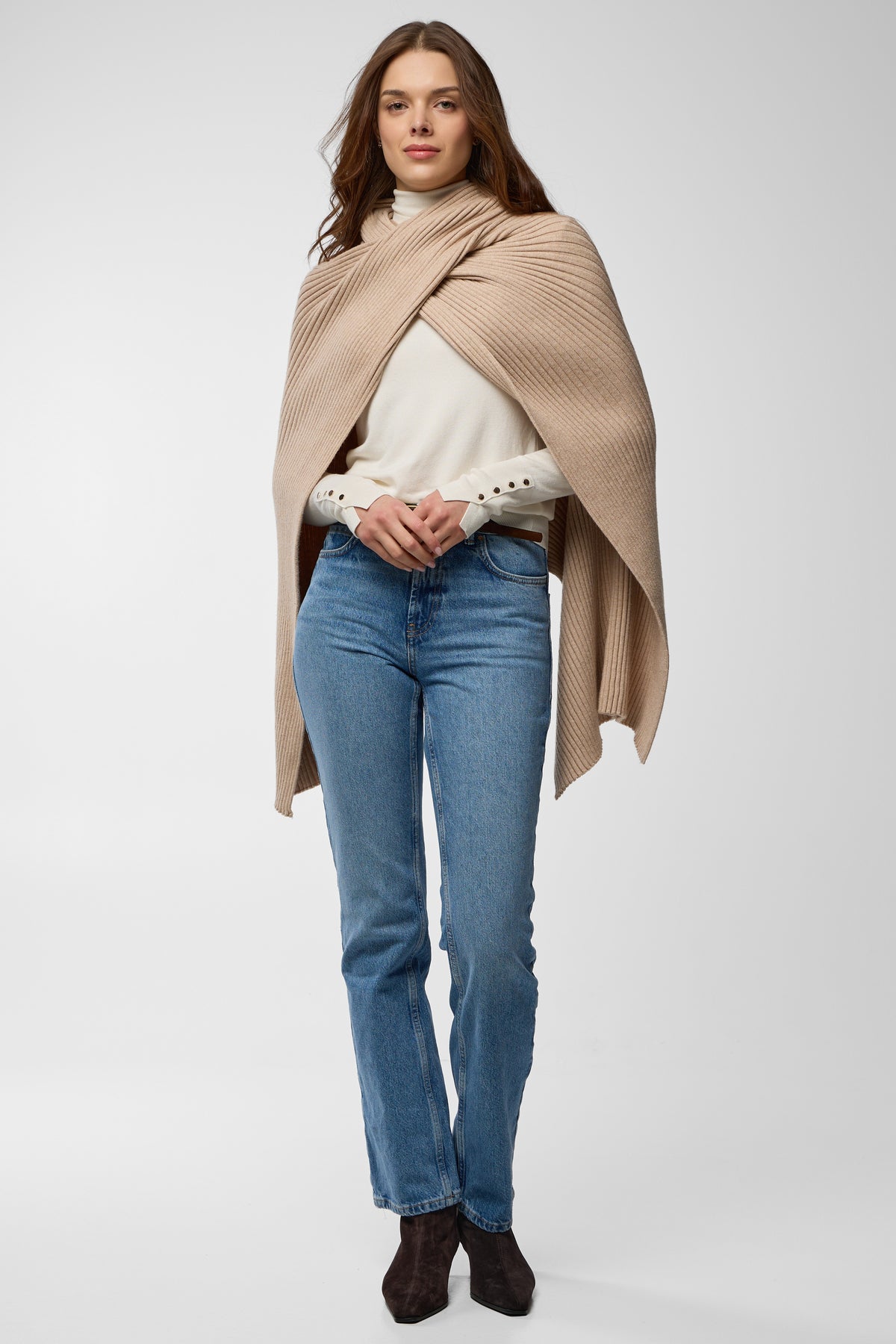 The Drapey Ribbed Shawl is the ultimate cozy-chic accessory, featuring a soft, voluminous knit with a bold ribbed texture. The generous size and asymmetrical cut allow for an effortless, drapey silhouette that adds instant warmth and sophistication to any look. For a chic travel or weekend look, belt this shawl over a fitted turtleneck and leggings, or simply toss it over a leather jacket for a contrasting texture.