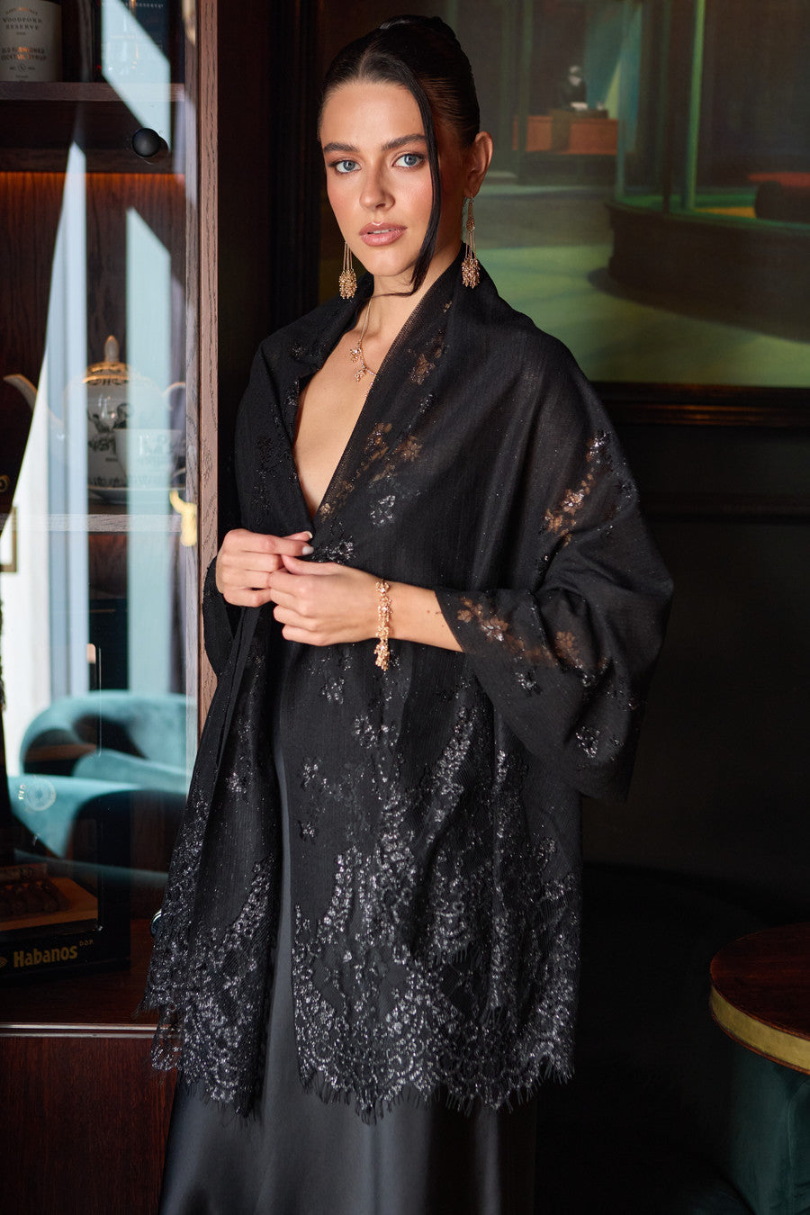 Elevate your ensemble with our Lace Shimmer Scarf, a delicate accessory perfect for adding ethereal elegance. This exquisite scarf features intricate lace detailing adorned with subtle shimmer, creating a beautifully textured and radiant effect. Perfect for adding a touch of sophisticated sparkle, it effortlessly complements evening wear, special occasion attire, or can be layered to enhance a chic daytime look.