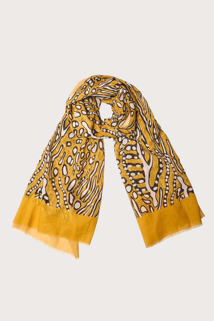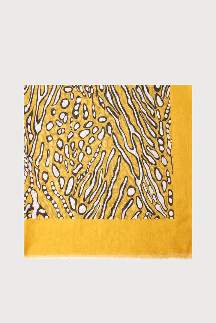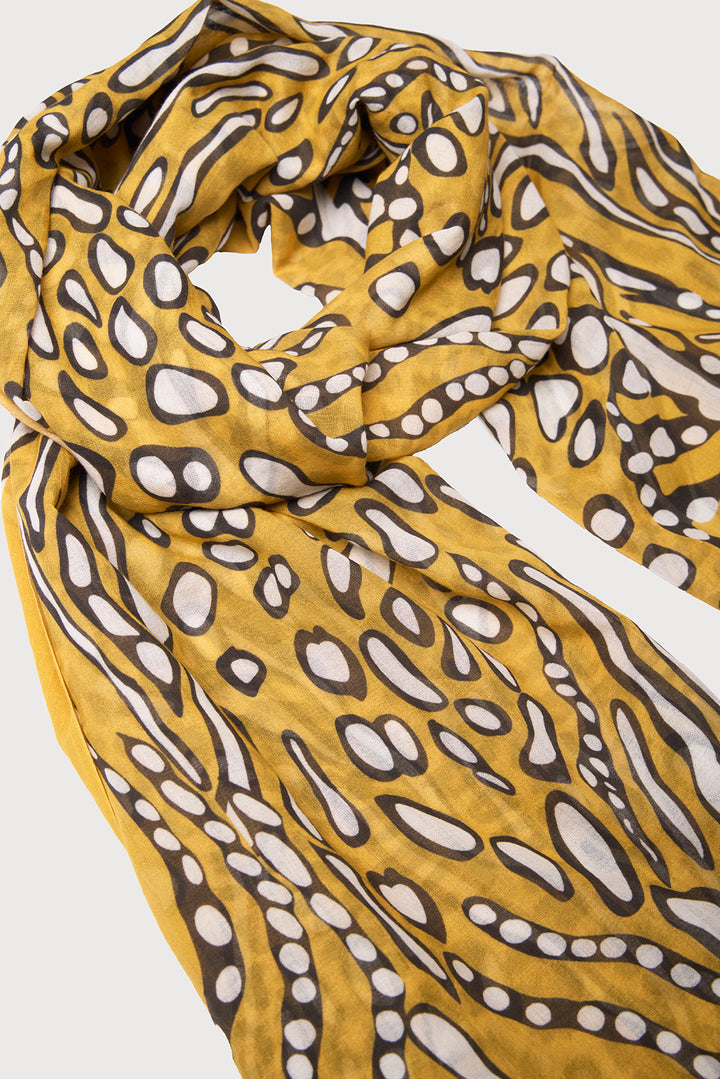 Our Abstract Animal Print Scarf features a golden mustard base with bubbly zebra and cheetah prints, offering a fresh twist on classic patterns. Made from breathable 100% cotton, it includes a textured eyelash fringe for added style. Perfect to wear over a tank or bathing suit or paired with the matching Abstract Animal Print Tunic for a bold, cohesive look.