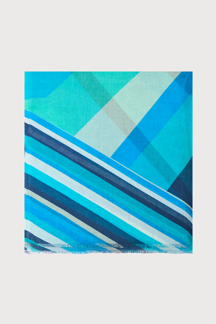 Our Marine Printed Scarf is a large, breathable accessory made from 100% cotton. It features multi-sized angular aquatic teal, navy, aqua, and white stripes. Delicate eyelash fringe at the hem adds a touch of elegance to any outfit. Perfect for summer, it complements a tank and jeans or doubles as a beach cover-up when paired with the Marine Tie Front Kaftan.