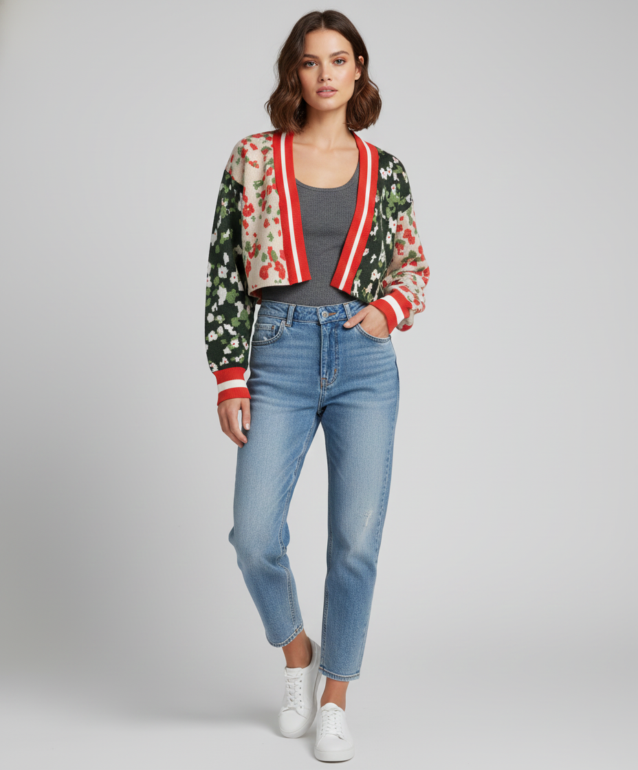 Discover our Multitone Floral Cardigan. This short sweater features a striking contrast of dark and pastel floral blocks, accented by bright striped orange cuff sleeves and an open front. Perfect for layering over dresses, jeans, or work attire, it adds a touch of festive flair to any outfit.